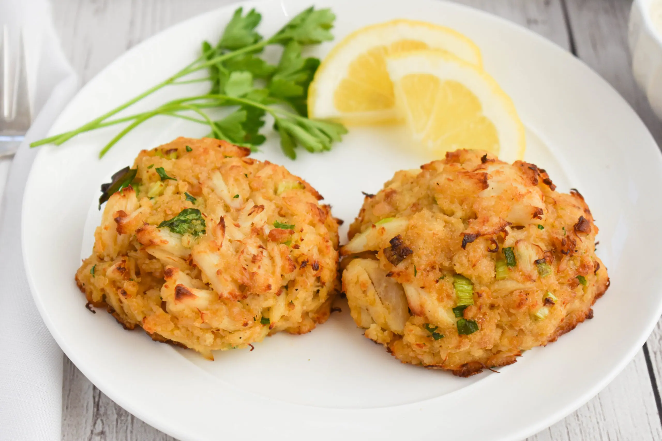 Two pan-seared crab cakes with zesty remoulade sauce.