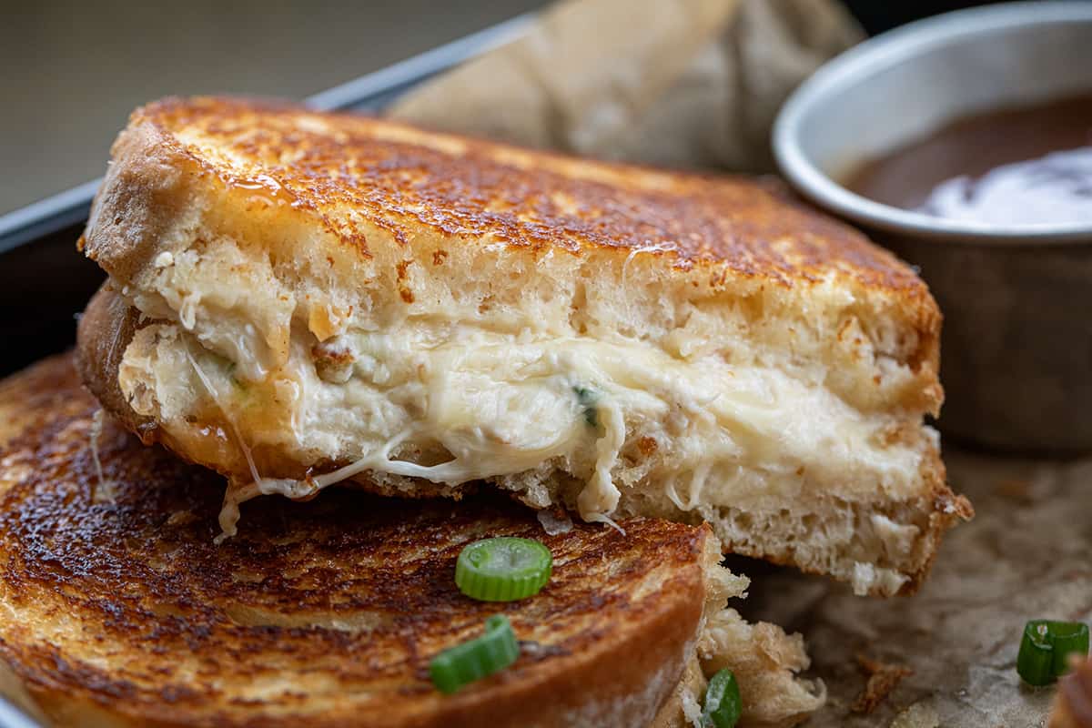 Crab meat, melted cheddar, and avocado on sourdough, with a side salad.
