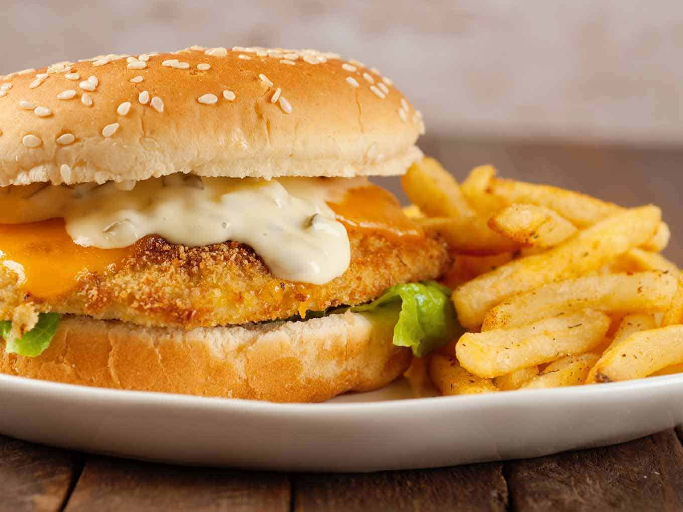 Fried fish fillet with lettuce, tomato, tartar sauce on a brioche bun.